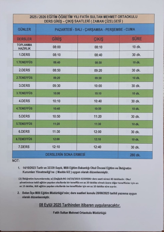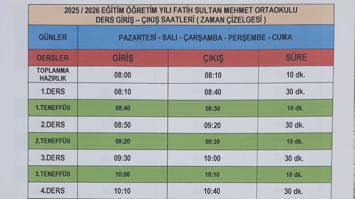 2025-2026 Eğitim öğretim yılında okulumuzda uygulanan ders giriş çıkış saatleri.